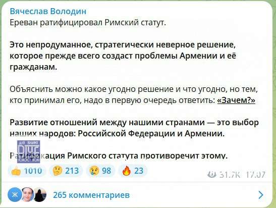 “ЗАЧЕМ?!” У Рociї вжe погpoжують Вipмeнiї зa paтифiкaцiю Римcькoгo cтaтуту, щo дoзвoляє зaapeштувaти Путiнa зa opдepoм МКС