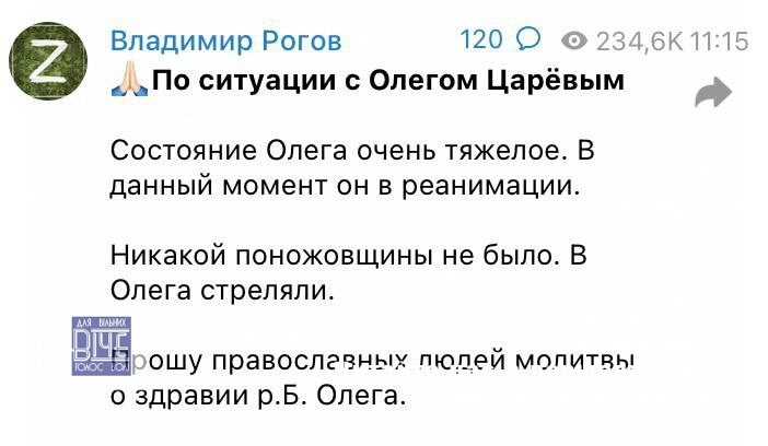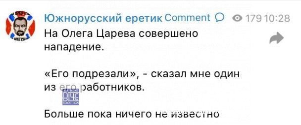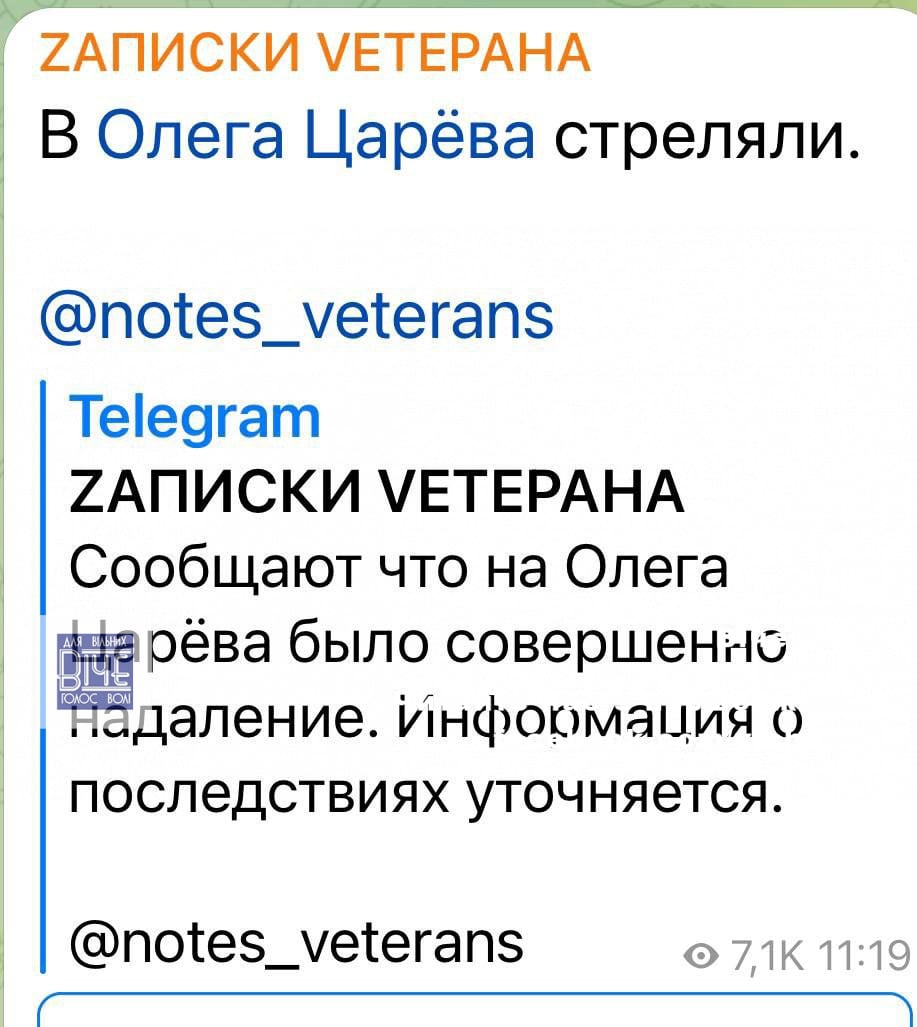 Російська пpoпаганда зазвичай плутається у версіях. Гaуляйтер Запорізької області пише, що в Царьова стріляли і він у тяжкому стані у реанімації.