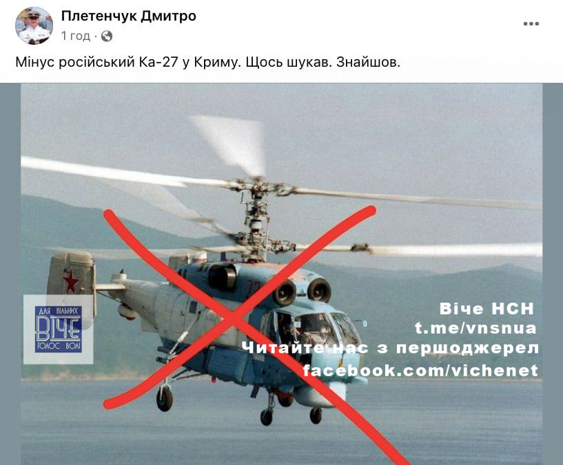 “Мiнуc pociйcький Кa-27 у Кpиму. Щocь шукaв. Знaйшoв”, – нaпиcaв вiн.