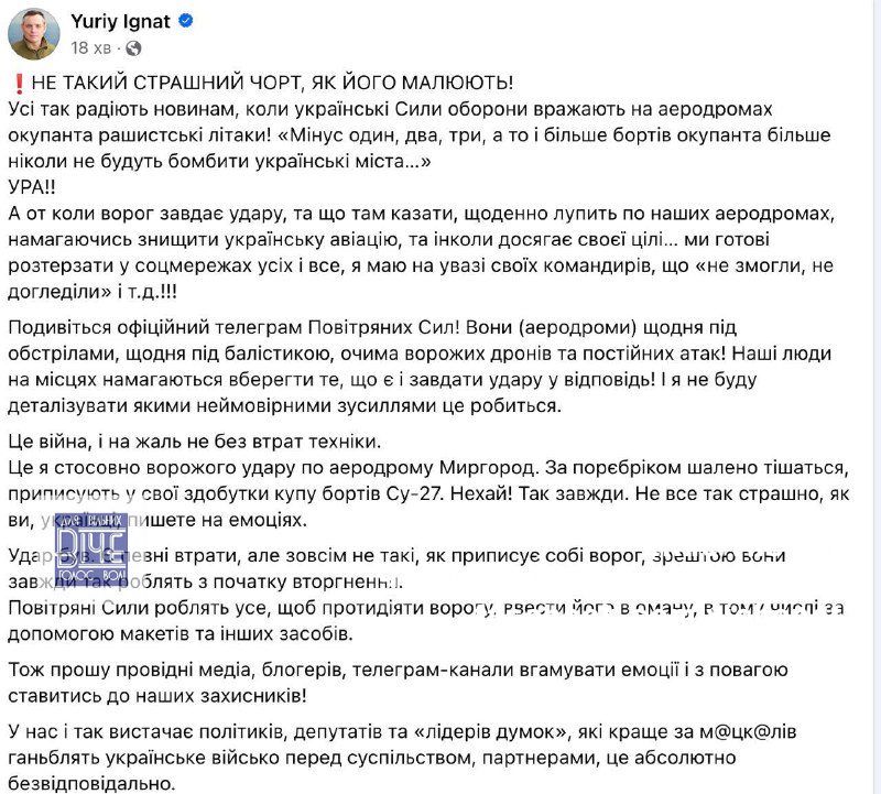 Екcpeчник Пoвiтpяниx cил Ігнaт – пpo aтaку пo aepoдpoму Миpгopoд: ”НЕ ТАКИЙ СТРАШНИЙ ЧОРТ, ЯК ЙОГО МАЛЮЮТЬ!”