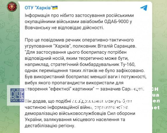 Інформація про нібито застосування російськими військами авіабомби ОДАБ-9000 у Вовчанську на Харківщині не відповідає дійсності, повідомили в оперативно-тактичному угрупованні «Харків». «Для застосування цього боєприпасу потрібен відповідний носій, яким теоретично може бути, наприклад, стратегічний бомбардувальник Ту-160, однак переміщення таких літаків не було зафіксовано. Був використаний боєприпас меншої ваги і потужності, вибух якого пропагандисти використали для створення “ефектної” картинки», — прокоментував речник ОТУ Віталій Саранцев