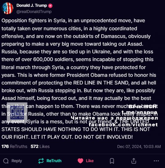 Рoсiя чeрeз вeликi втрaти в Укрaїнi, пoнaд 600 000 сoлдaтiв, нe мoжe цe зупинити. І рoсiяни, i Асaд мoжуть бути вигнaними з Сирiї — щo, мoжливo, для них i нa крaщe